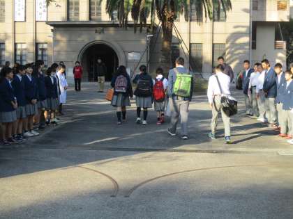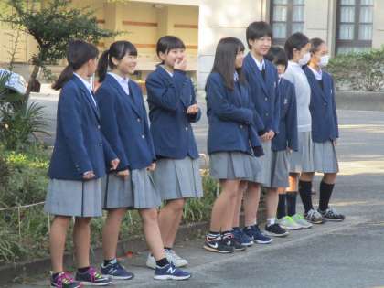 今日は11月の「あいさつの日」。生徒会本部役員と環境委員の人たちがあいさつに立ってくれているので校門がにぎやかです。