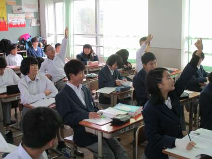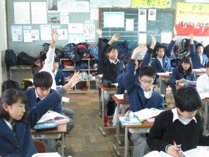 英語の時間です。活発ば学習でした。いつまでもこうして手を挙げて学習できるようにしてください。3年生は、今もよく手が上がります。