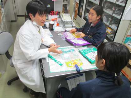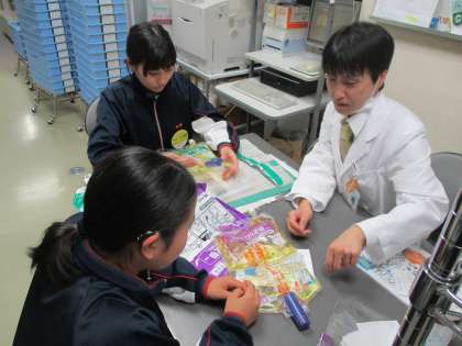 病院で、薬剤師さんの話を聴いている2人の様子です。2人とも医療に興味があるらしく、熱心に話を聴いていました。