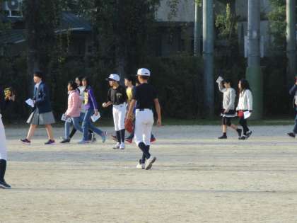 野球部。水泳部、テニス部を見学する小学生の様子です。