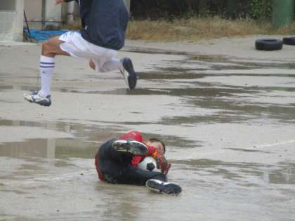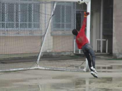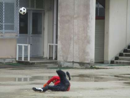 選考会を受けに行くにあたって、練習に来ていました。試験前でもあるので1時間ほどですが、雨の中を顧問の先生と2人3脚で二条ランヤゴールキーピングの練習に励んでいました。