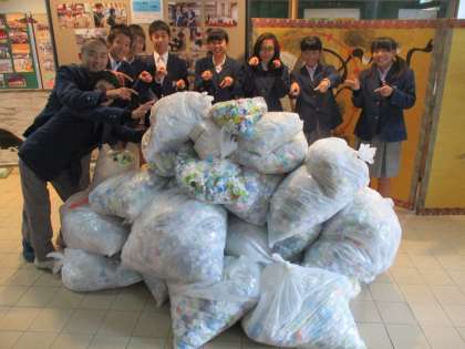 彼らの前のごみ袋に詰まっているものは、これまで小学校と一緒になってコツコツと集めてきたペットボトルキャップです。