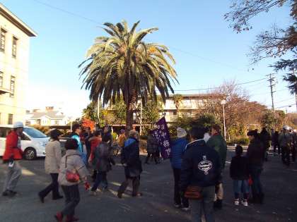 今日は,出水学区の総合防災訓練が行われました。震度6強の巨大地震が発生したという想定です。町毎に集まり,丸太町より南の住民の方々は,二条中学校へ集合してから二条城北小学校へ避難します。丸太町より北の住民の方々は直接二条城北小学校へ避難します。
