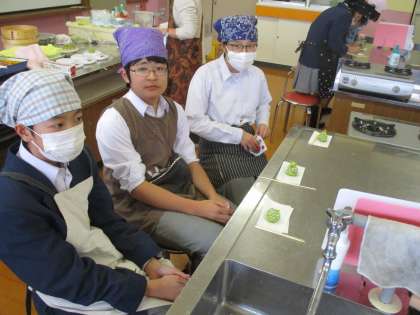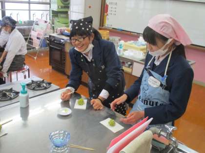 5・6時間目、地域の和菓子屋さんに来ていただいて和菓子作りを体験させて頂きました。下ごしらえをしてきてくださっているので、案外早く出来上がりました。