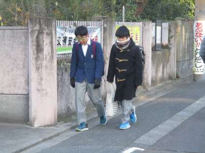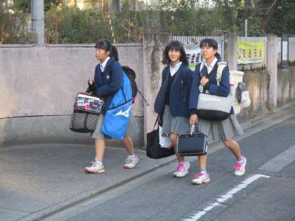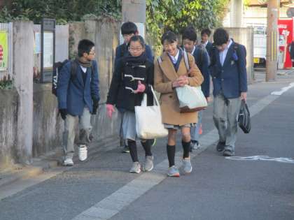 女子の脚が寒そうです。せめてハイソックスをはきましょう。