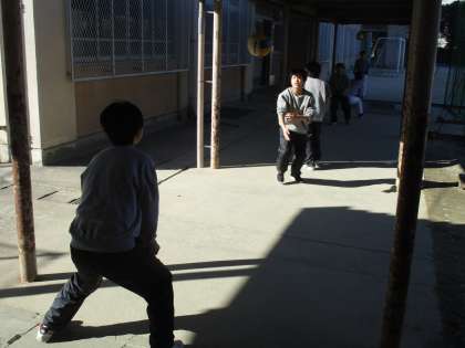 この時は順番待ちのようで、渡り廊下でパスの練習です。