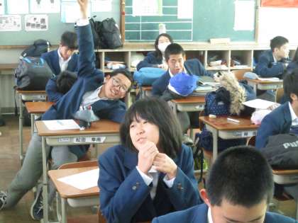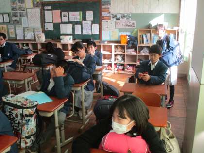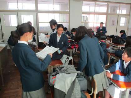 1組では生徒が分担して配りものをしています。このあと、代表生徒の司会進行で学活が始まりました。