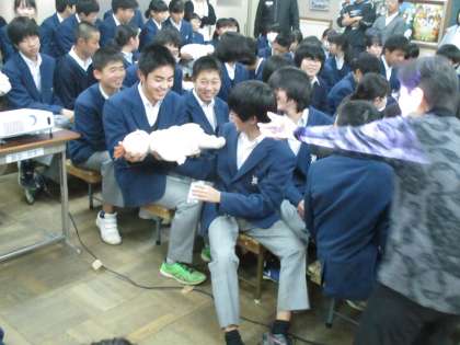 話が一通り終わって、最後に生まれたばかりの赤ちゃんの人形を抱っこさせてもらいました。大体身長が50センチメートル、体重は3キログラムです。