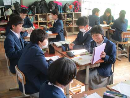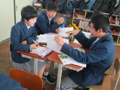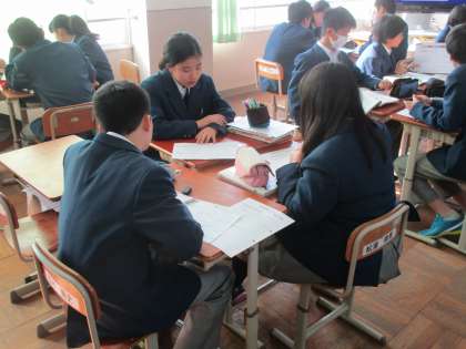 グループごとに考えを発表しています。発表者だけでなく、聴く方の態度もよかったです。よい授業でした。