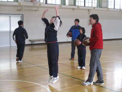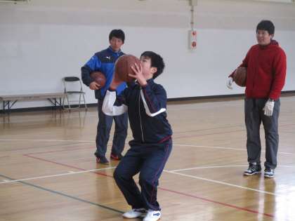 6組の3人が体育でバスケットボールを頑張っていました。