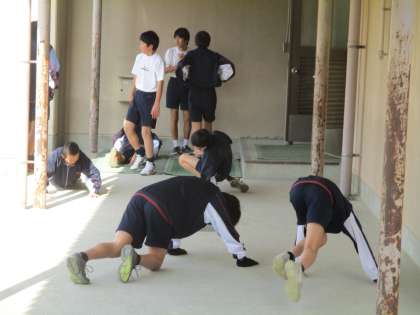 休み時間が終わりに近づくと、5時間目が体育の1年生たちが準備運動を始めました。