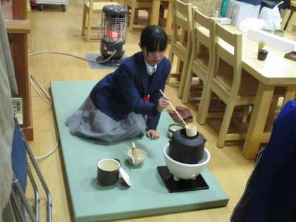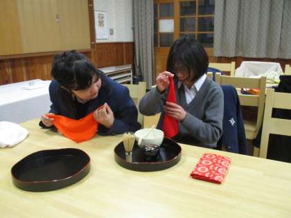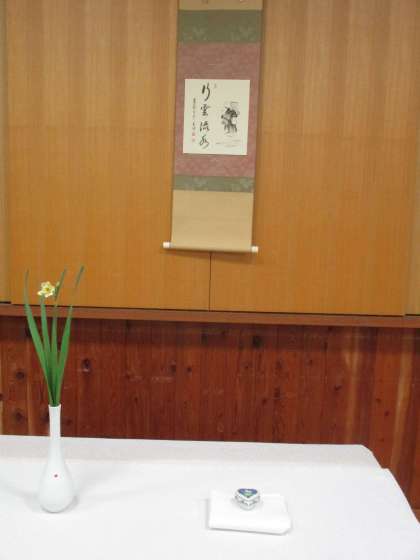 2月10日(土)茶道体験学習を行いました。軸は東福寺同聚院前住職西部文浄師『行雲流水』(複製)の画讃を掛け、白磁丹頂花入れに二条中の水仙を入れ、一角獣のハートの形の香合を荘りました。お菓子は、亀広脇さんの鶯餅、と梅の絵のおせんべいを美味しくいただきました。