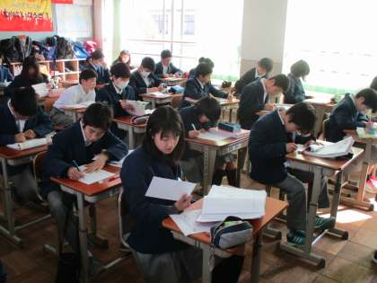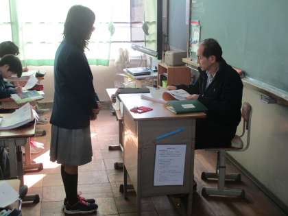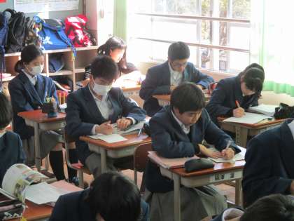 明日からの「学年末テスト」に向けて自習しています。その間に先生が一人ずつ前に読んでノートの点検です。