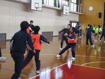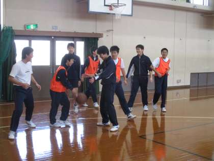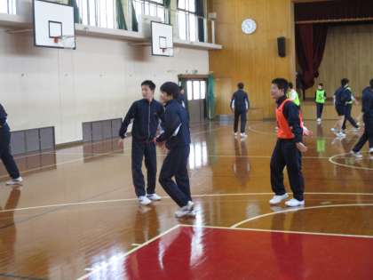 まずは講堂に上がりました。1・2組男子のバスケットボールです。