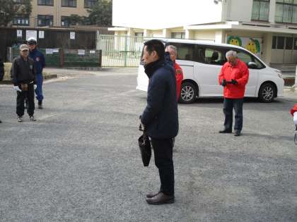 自主防災会の会長、学校長の挨拶に続いて、教頭先生から今日の点検個所の確認がありました。