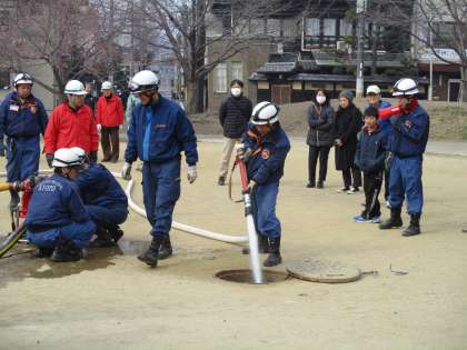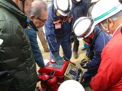 実際にポンプを動かし、放水の訓練です。