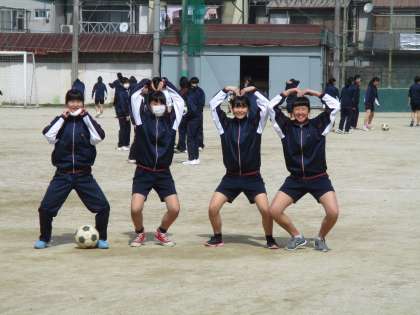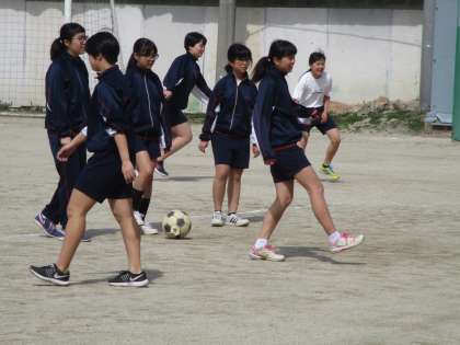 グランドでは女子がサッカーです。授業が始まるところです。