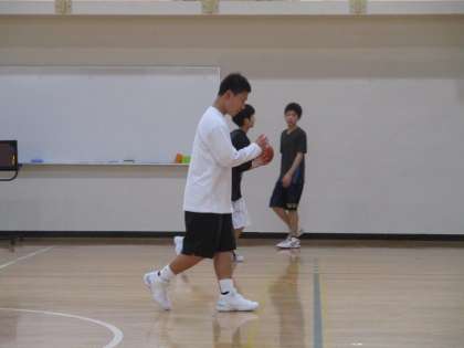 体育館では男子バスケットボール部が元気に練習しています。卒業生が来て雰囲気を引き締めてくれてもいます。