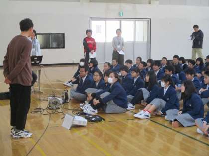 学年所属の先生方が、順番に自分のことを話していました。生徒にとっては、こういうのは楽しい時間です。
