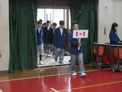 吹奏楽部の演奏に乗って新入生の入場です。司会は生徒会本部の中から出ています。