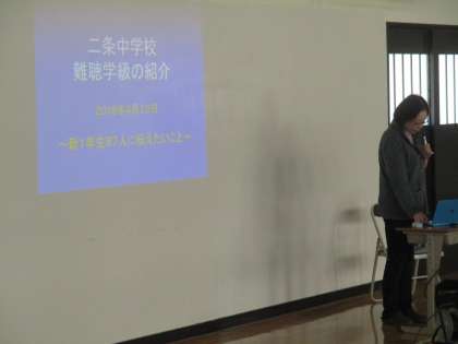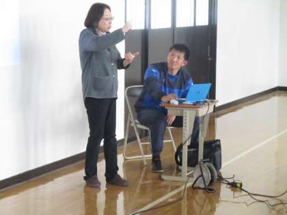 「国語」「社会」…など、簡単な手話が紹介もされました。真剣に聴いている生徒の様子がとてもよかったです。いい集会でした。