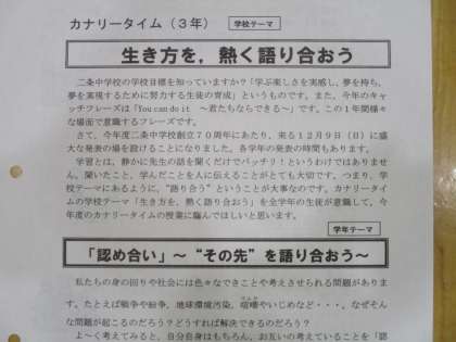 二条中学校の総合的な学習の今年度のテーマと、3年のテーマも発表されました。
