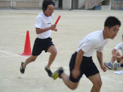 陸上競技のリレーに入ったようです。先ずは、陸上部の生徒が見本を見せます。さすがに上手でした。