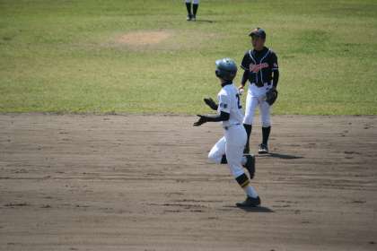 先頭バッターがファーボールで出塁してすかさず盗塁。