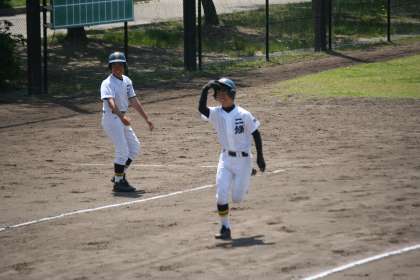 そして、2塁にランナーをおいて4番打者の登場です。昨日から当たっている彼が思い切り振りぬいた当たりは、何と岡崎グランドのフェンス直撃のホームラン。