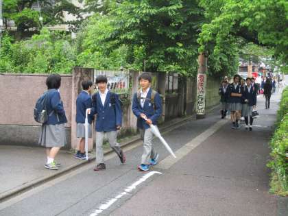 昨日の雨が残りました。生徒たちは傘を手に登校してきます。