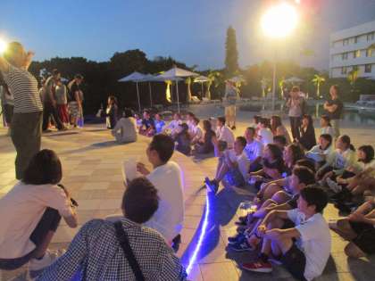 1つめは「平和セレモニー」です。修学旅行実行委員会が作成した「30年度二条中学校平和宣言」を平和の礎(いしじ)の前で声高らかに暗誦します。これまで見てきたすべては代表生徒によるもので、ほとんどの生徒は「気を付け」の姿勢でセレモニーへ参加します。ところが、今年度の3年生は「学年群読」で行いました。一人で言う場合も集団で言う場合もありますが、全員がどこかで声を発します。こんな「平和宣言」は初めてです。改めてこれはよい取組だと思いました。これまでやってこなかったこと(気づけなかったこと)を残念に思いましたし、こうすれば、より確実に平和宣言が自分(たち)のものになるとも言えます。照れることなく、また遠慮することもなく、大きな声で堂々と行うセレモニーは本当に感動的でした。また、そんなセレモニーを実行した生徒たちを頼もしくも誇らしくも思いました。