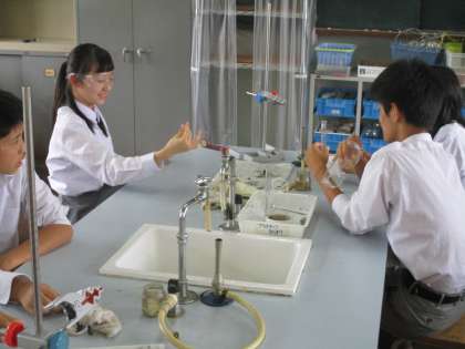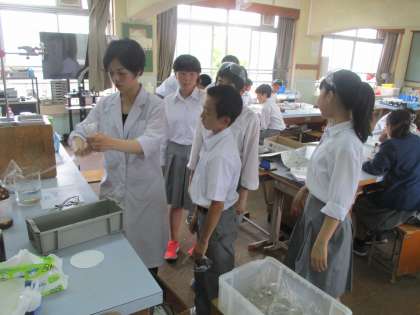 今日は実験室で塩酸を使った実験です。気を付けてください。