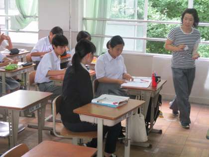 数学の時間に居るのは支援員の先生です。また、英語の時間には、本来この時間に5組を受け持っている先生が5組の生徒を中心に支援に入っています。