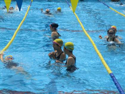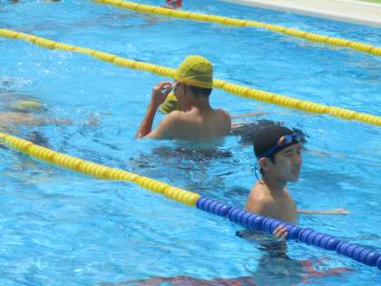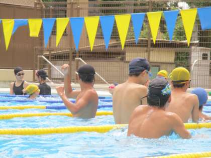写真を撮りにプールサイドに立つだけで背中に汗をかきました。