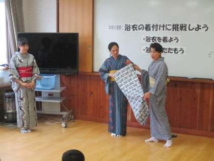 浴衣に着付けです。和服はなかなか着る機会がなくなりました。しかし、和の心を学ぶ上で身近ななかみです。