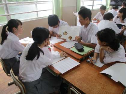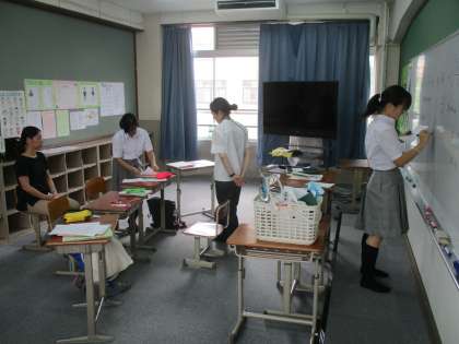 家庭科の時間には、グループごとに夏休みの宿題である料理のレシピを紹介し合っています。