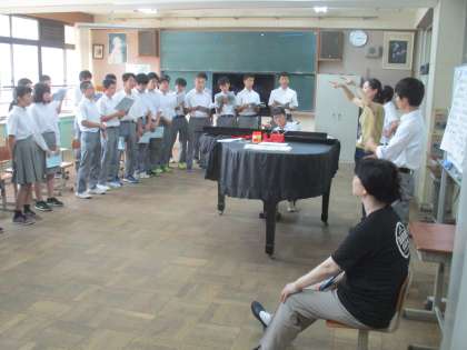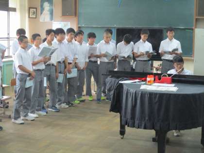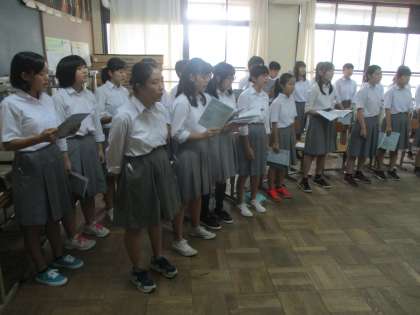 今年の3年生は、1クラスの人数が少ないので2クラスが合同で歌います。1・2組で2曲、3・4組で2曲です。
