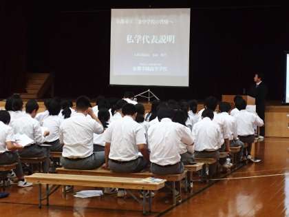 3年生が退場したのちは、保護者の方を対象に本校の進路指導主事から「入試日程」や「奨学金制度」などについてのお話をしました。