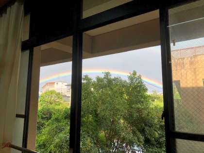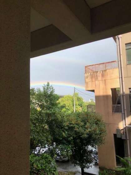 吹奏楽部が練習する音楽室の窓からきれいにかかった虹が見えました。