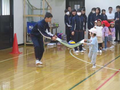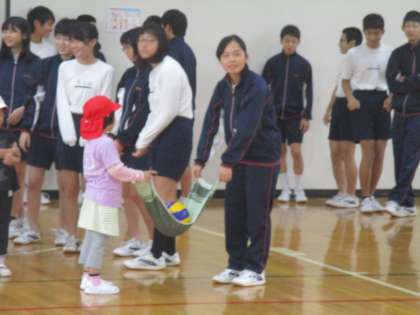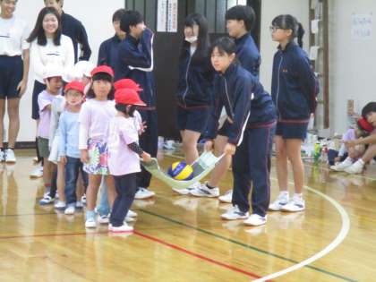 中学生と幼稚園児とがペアになって、タオルに乗せたボールを運ぶゲームです。
