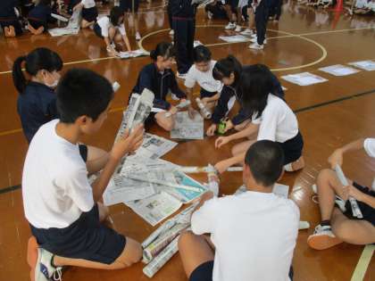 最後のゲームは、時間内に新聞紙とセロハンテープだけでどれだけ高いタワーを作れるかを競う競技です。