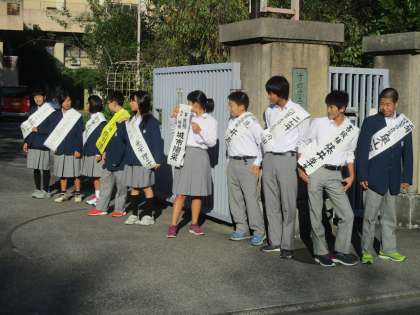 さて、今朝から本格的に生徒会役員立候補者による朝の選挙活動が行われています。校門は爽やかな声でにぎやかです。
