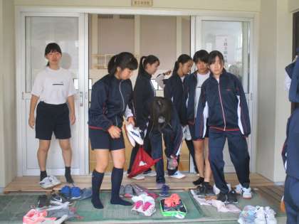 体育の時間を終えて女子が体育館から出てきました。