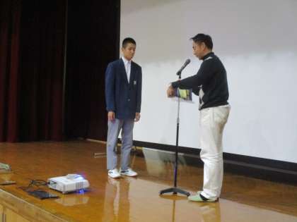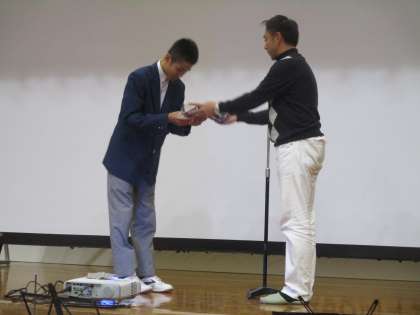 PTA会長から生徒会長へ記念のマフラータオルが手渡されました。