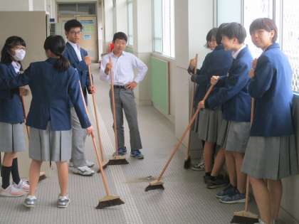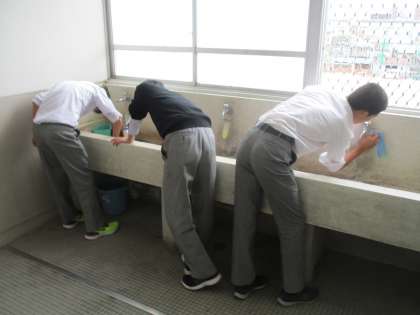 南校舎をあがっていくと、2年生が頑張って手洗い場や廊下の掃除に精を出していました。