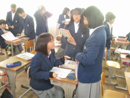 今日は道案内についてです。学習した基本のフレーズをペアで練習しています。