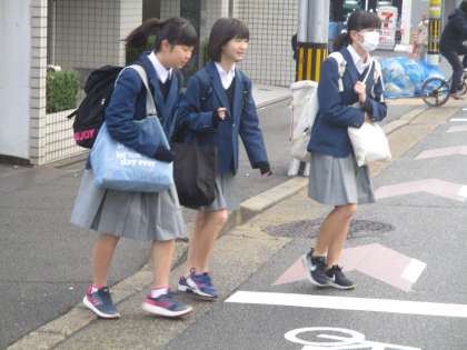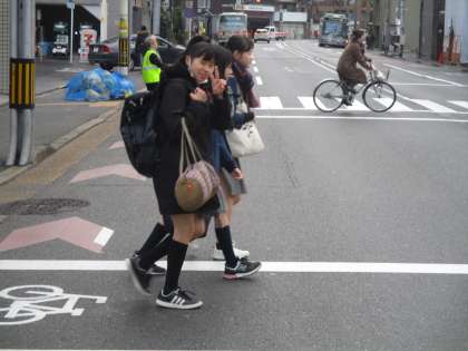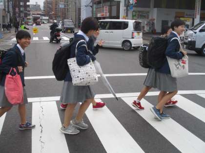 校長が経っていることが珍しいからか、生徒たちの多くが照れくさそうに笑いながら交差点を渡っていきます。