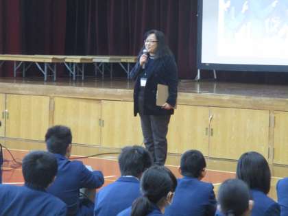 学校長の話の後、今日で学校を去られる山元先生からスピーチを頂きました。