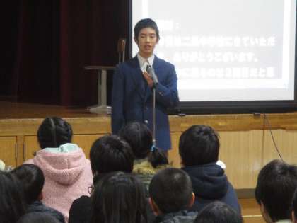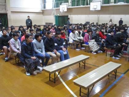 全体会では、生徒会分部の人たちが活躍してました。はじめのことばの様子です。
