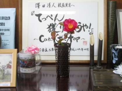 昨日、持ってきた山茶花のつぼみが見事に開きました。
